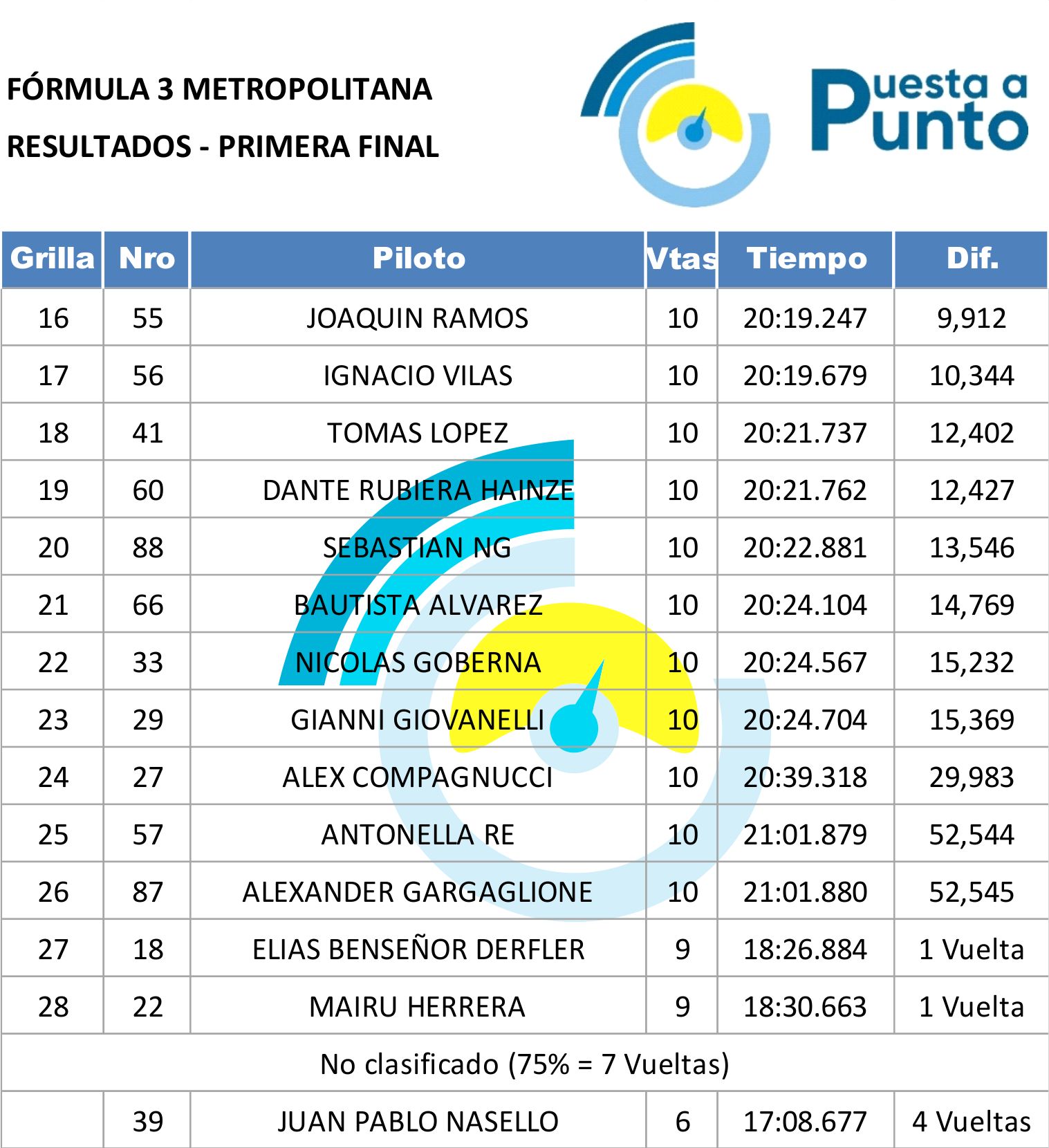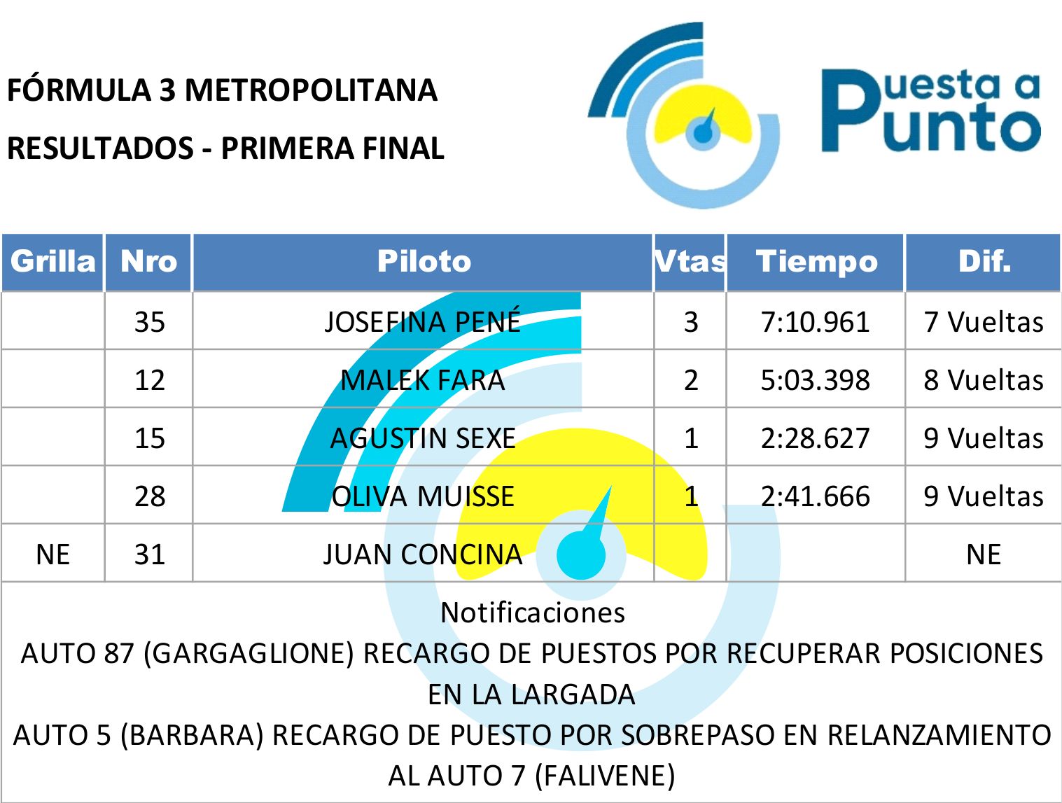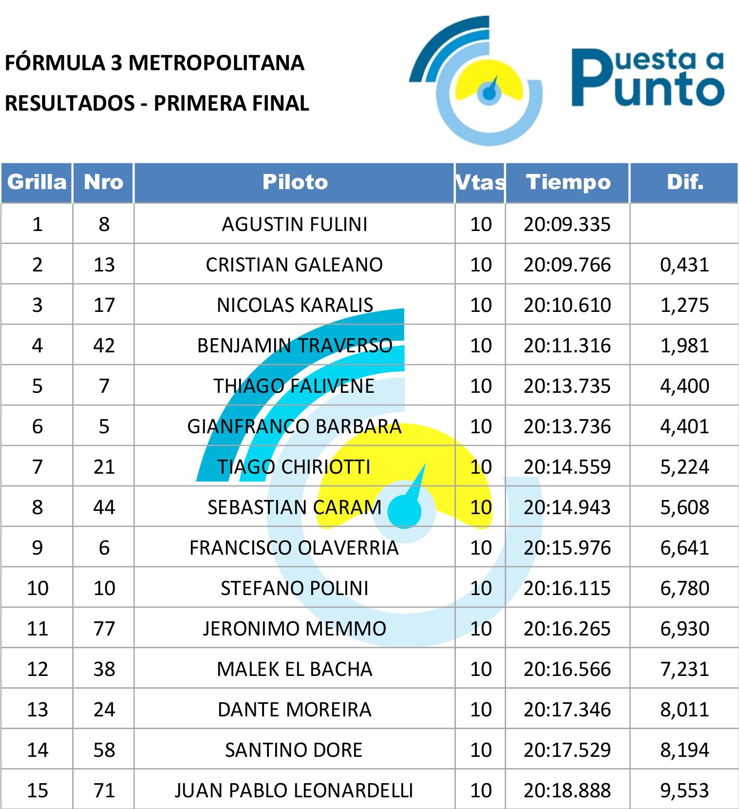 Mañana, la Final será a las 11.05, con un total de 12 vueltas o un máximo de 20 minutos, y sera transmitida en vivo por Puesta a Punto, para la Red Federal de Automovilismo (más de 100 emisoras en todo el país), y por todas nuestras plataformas digitales.