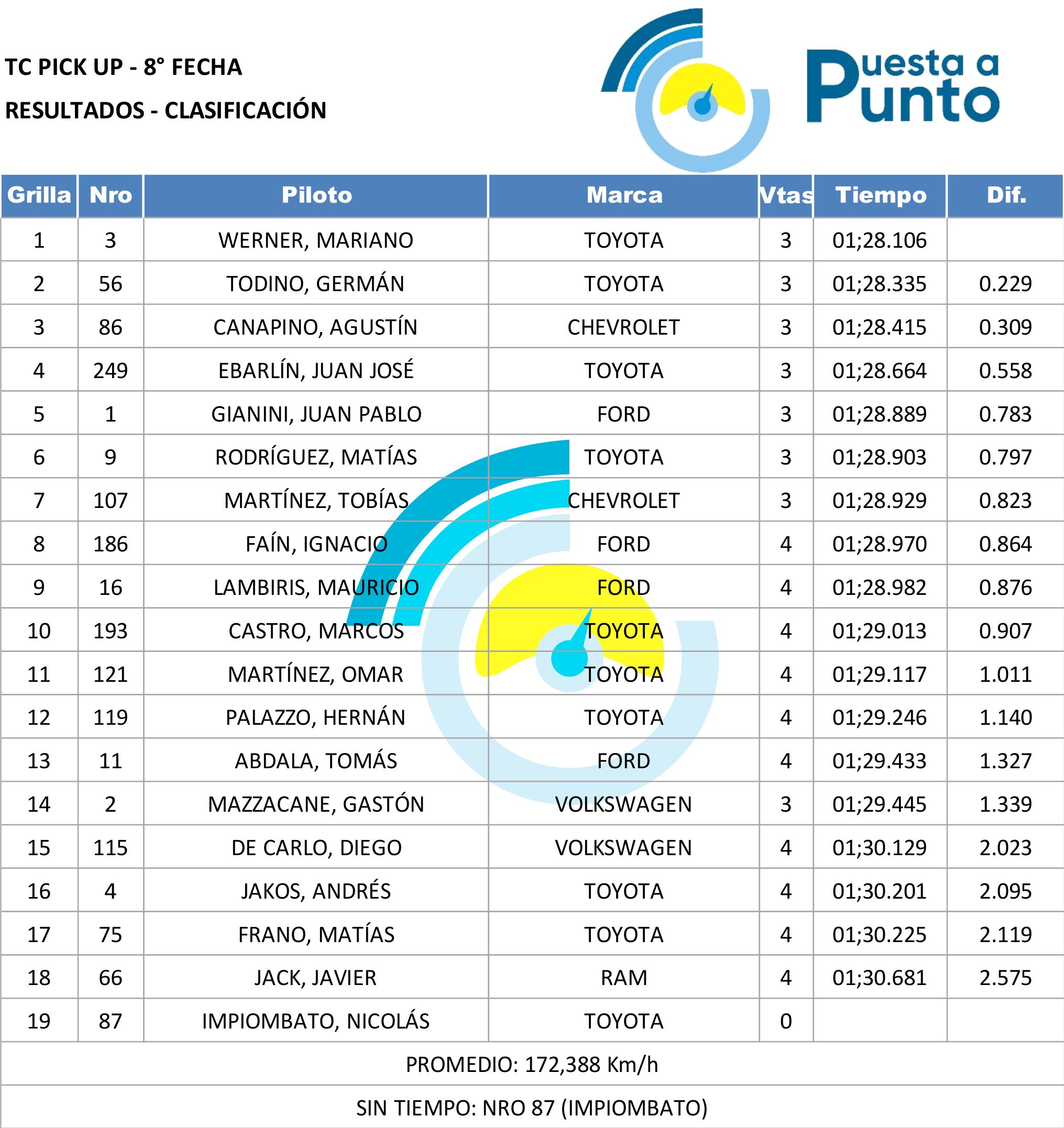 El "Zorro" estableció 1.28:106 y quiere ir en búsqueda de la victoria que se le viene negando durante esta temporada. Lo relegó a la segunda ubicación a Germán Todino por 229 milésimas, y lo dejó tercero a Agustín Canapino por 309 milésimas.
